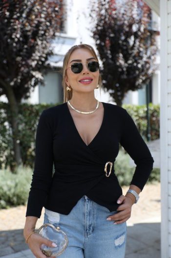 Viskon Kadın Zarif Dokunuş Uzun Kollu Kruvaze Yakalı Toka Detaylı Bluz
