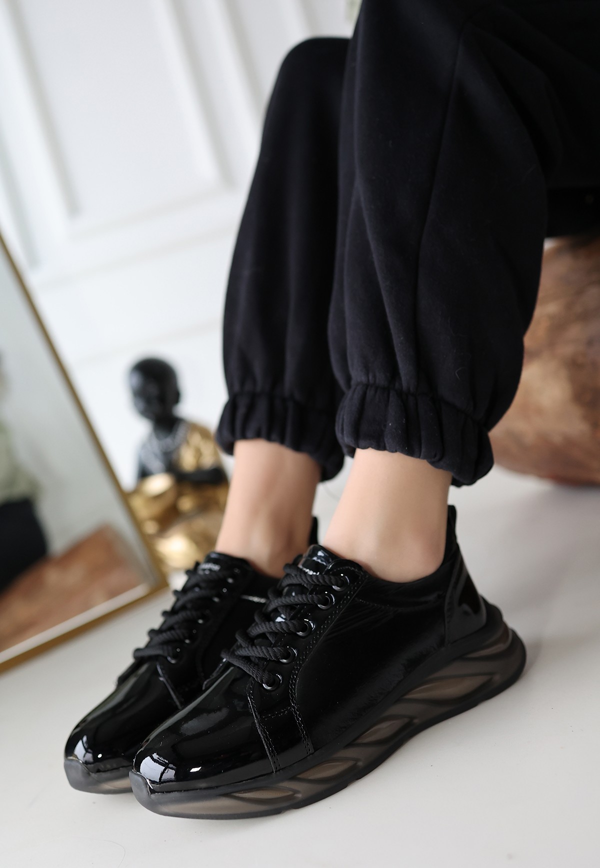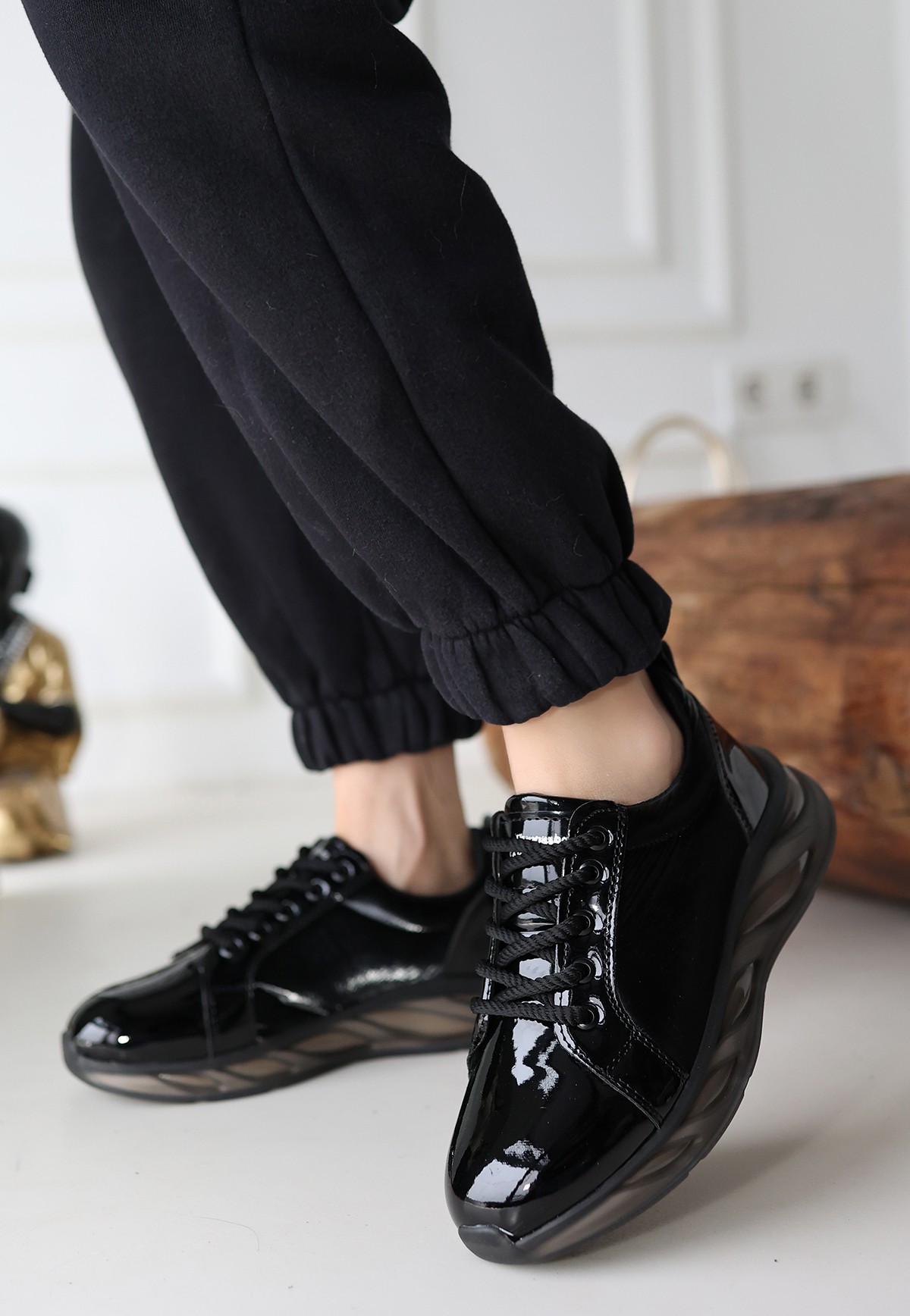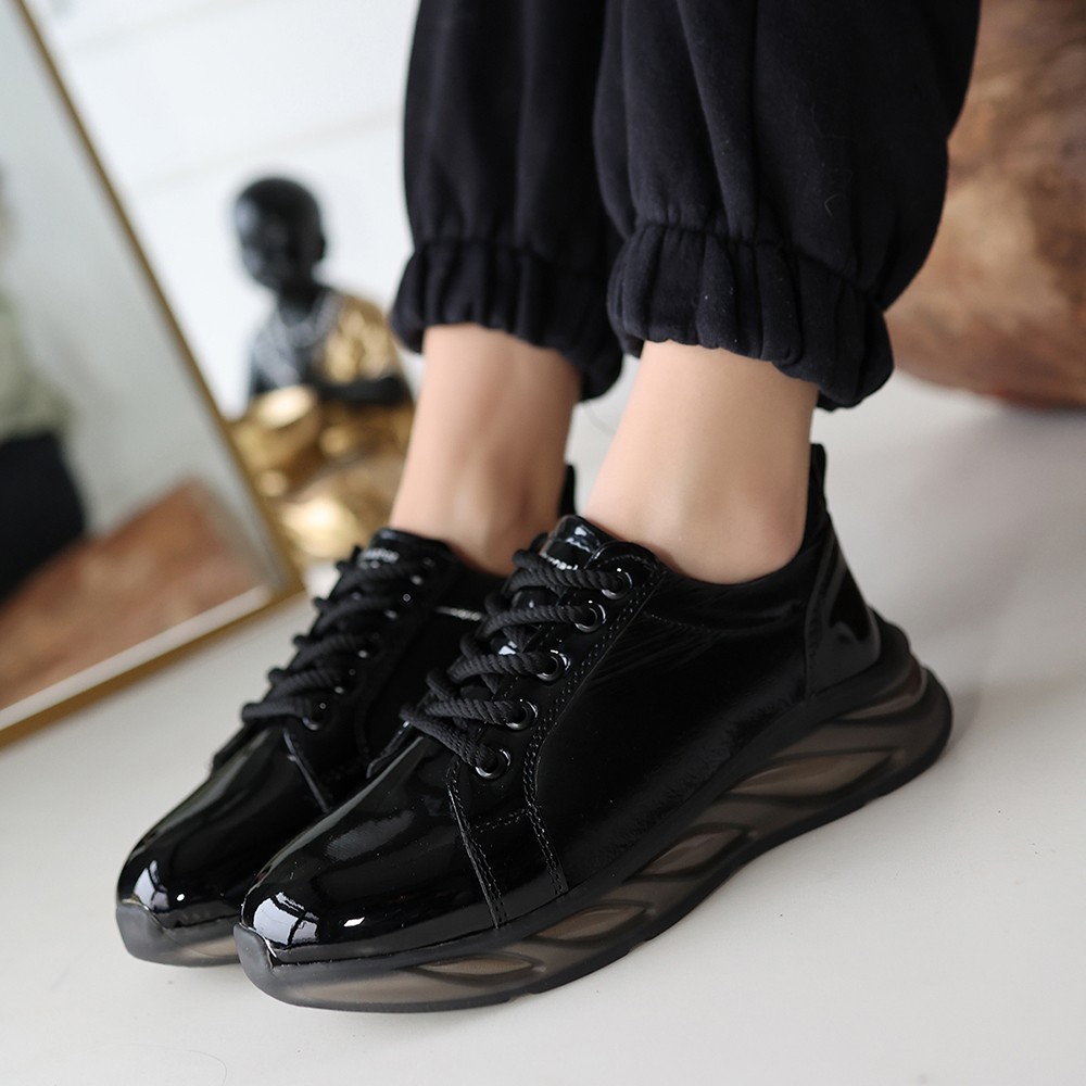 Kadın Konforlu Adım Piona Siyah Rugan Gri Tabanlı Spor Ayakkabı