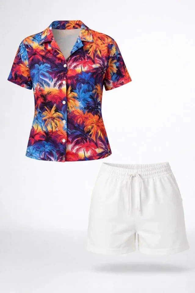 Renkli Tropikal Palmiye Desenli Kısa Kol Gömlek Şort Takım Yazlık Rahat Kalıp – Desenli