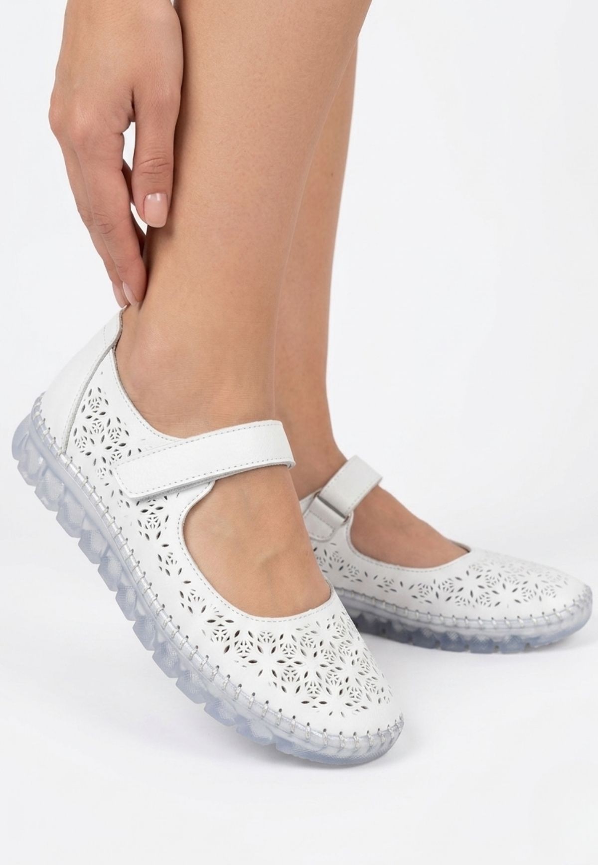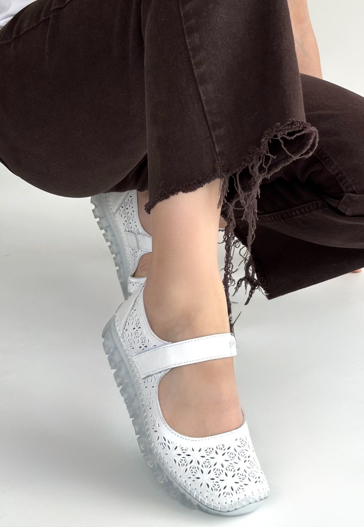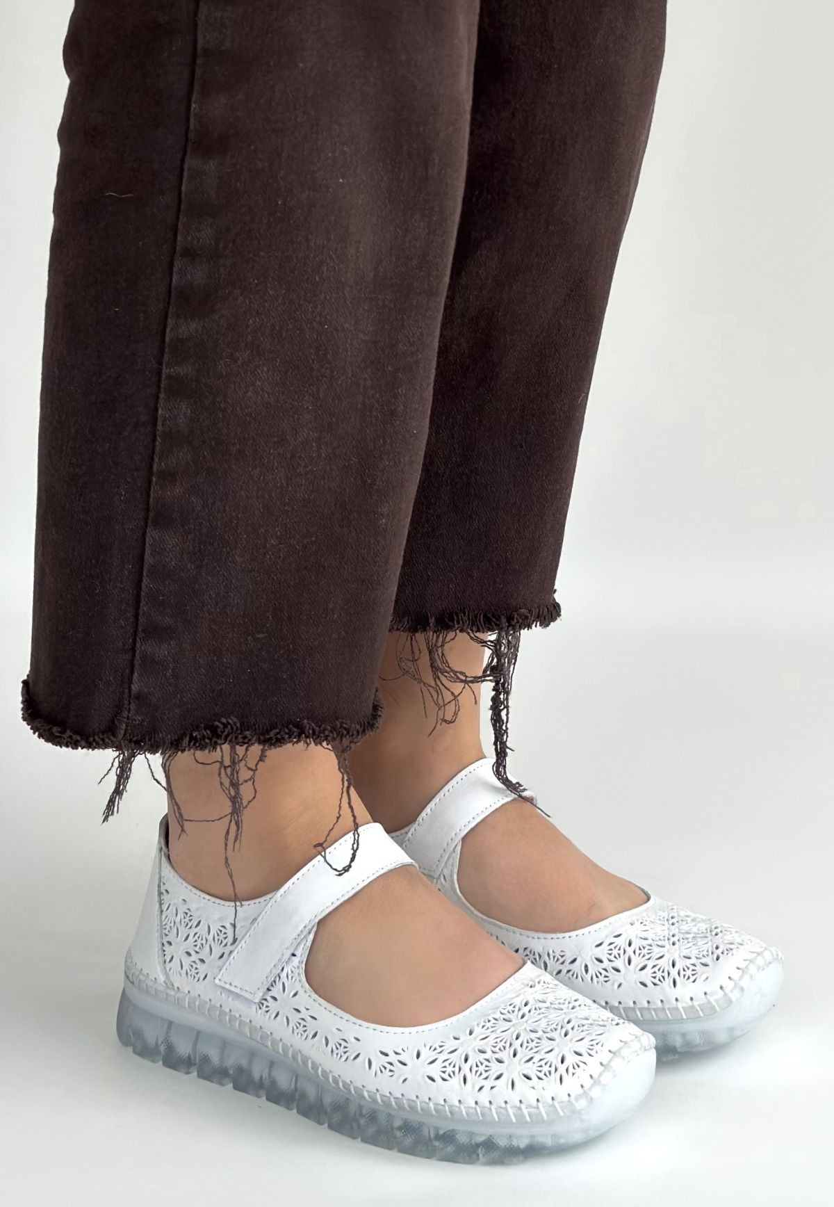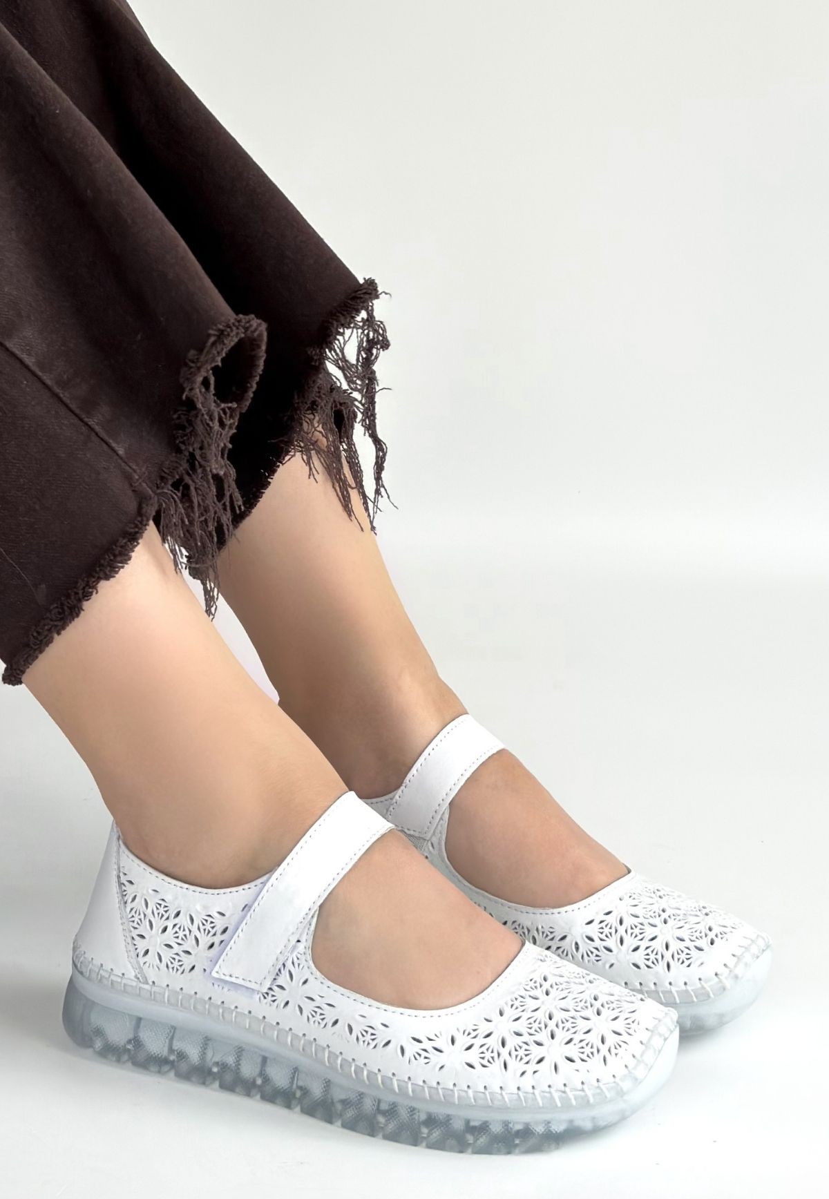 Sina Beyaz Deri Cırt Cırtlı Babet Ayakkabı