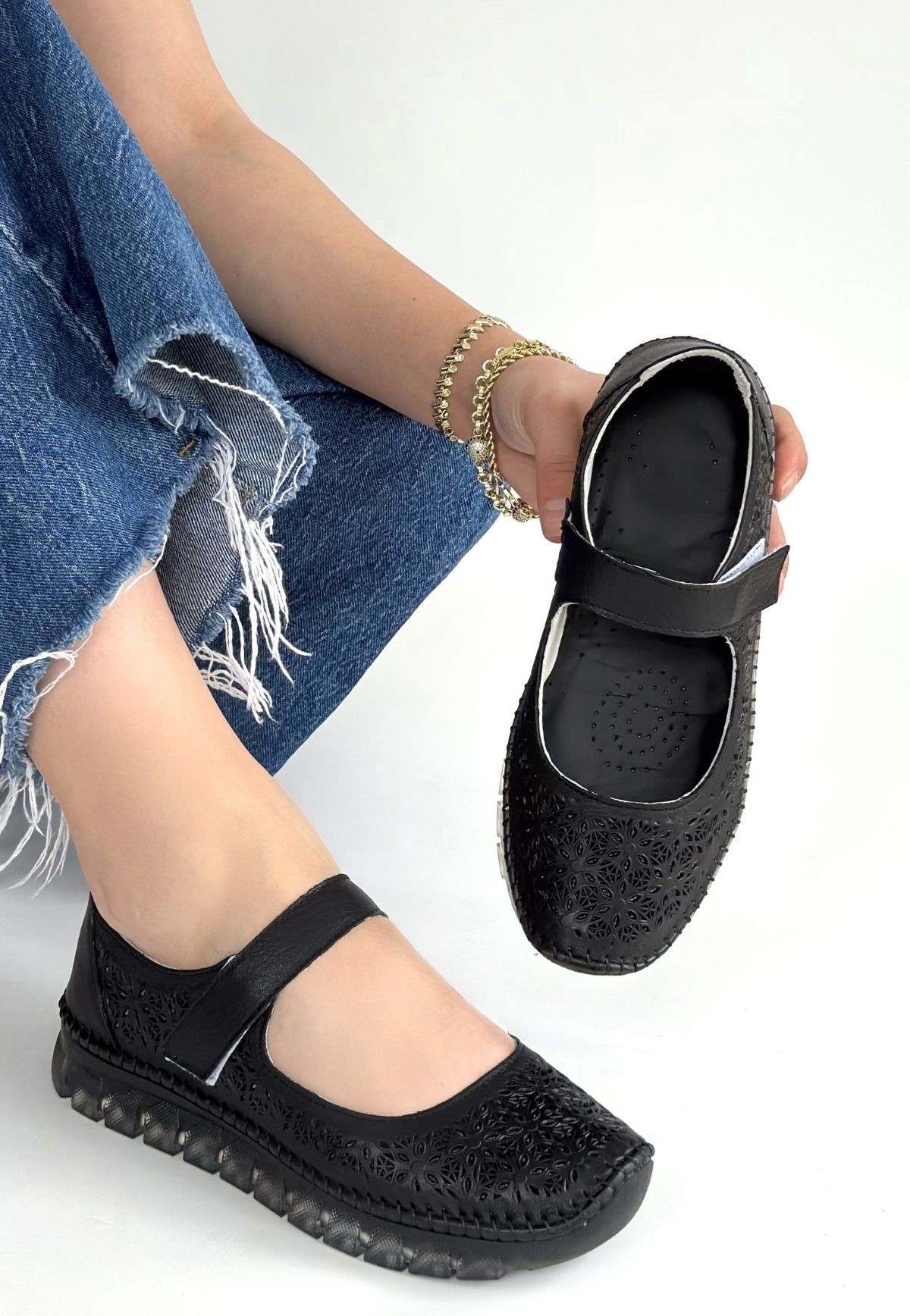 Sina Siyah Deri Cırt Cırtlı Babet Ayakkabı