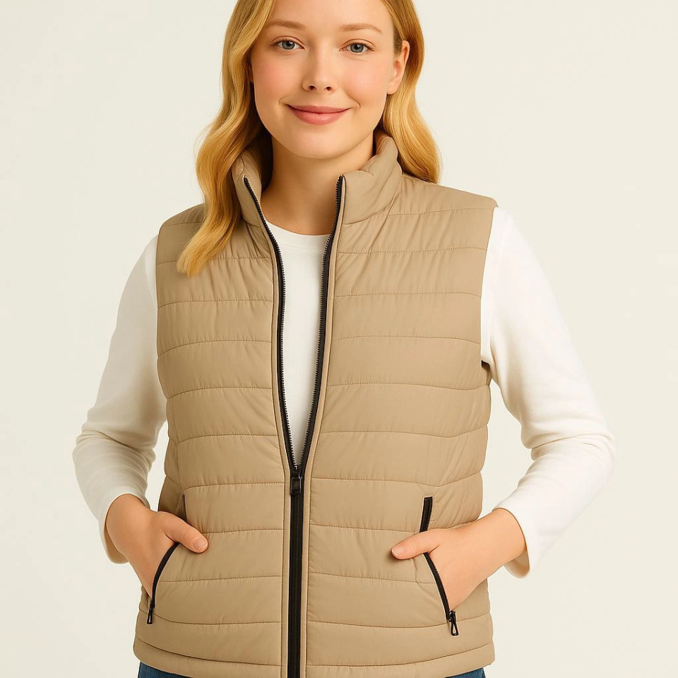 Şişme Fermuarlı Yelek Su Itici Kapitone Astarlı Kumaş Cepli Hafif Kışlık Spor Rahat Kalıp – Bej