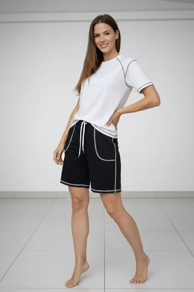 Kadın Rahat Kullanım Beyaz Spor Tişört Kontrast Dikiş Detaylı Ovarsize Rahat Kalıp Şort Takım