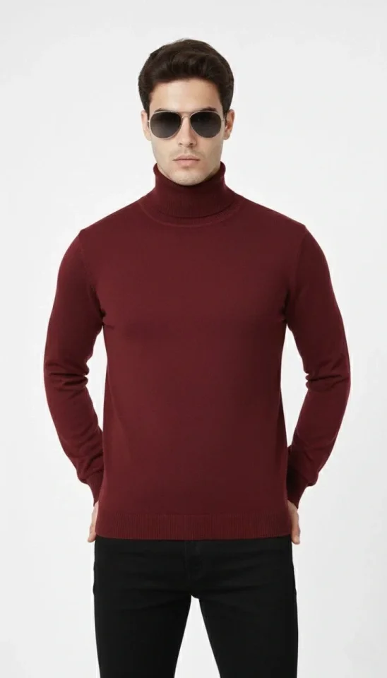 Tam Boğazlı Balıkcı Yaka Triko Kazak Yumuşak Dokulu Pamuklu Ince Dokuma, Uzun Kollu Rahat Regular Kalıp – Bordo