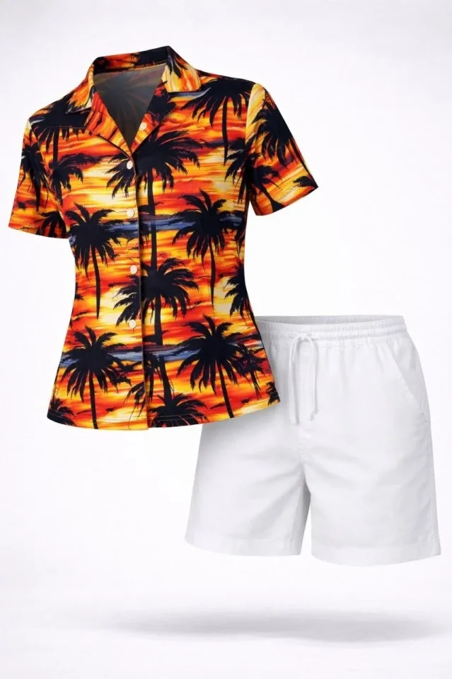 Tropikal Palmiye Desenli Gömlek Şort Takım Yazlık Rahat Kalıp – Desenli