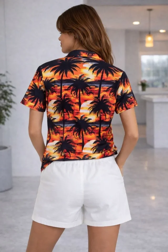 Desenli Kadın Rahat Kullanım Tropikal Palmiye Gömlek Yazlık Rahat Kalıp Şort Takım