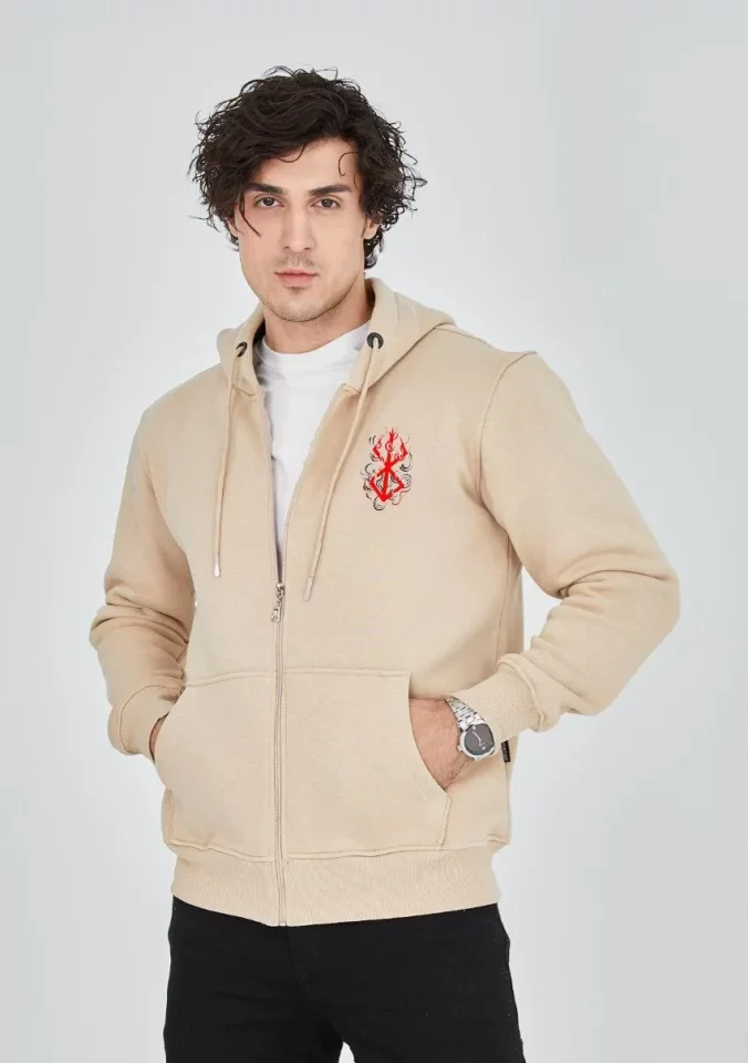 Unisex Baskılı Tam Fermuarlı Kapşonlu SweatShirt – Bej