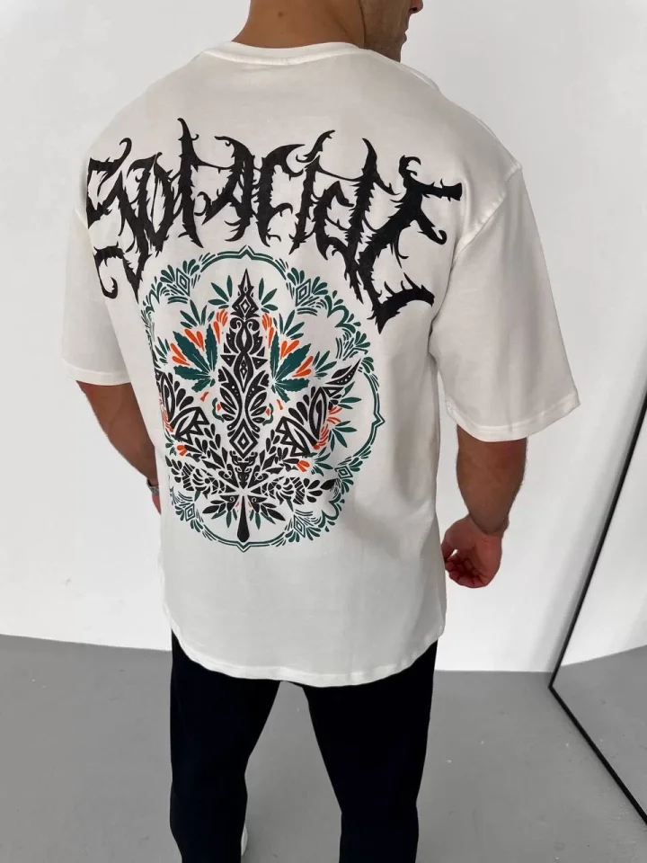 Unisex Bisiklet Yaka Baskılı Oversize T-Shirt – Beyaz
