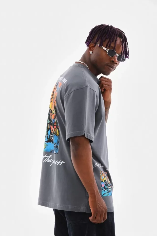 Unisex Bisiklet Yaka Baskılı Oversize T-Shirt – Gri