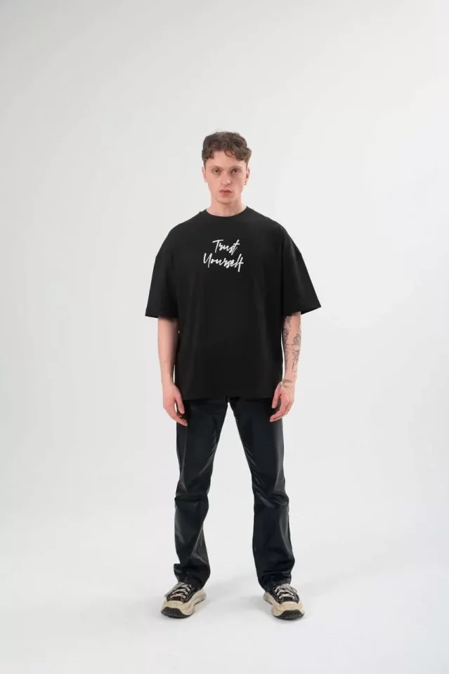 Unisex Bisiklet Yaka Baskılı Oversize T-Shirt – Siyah