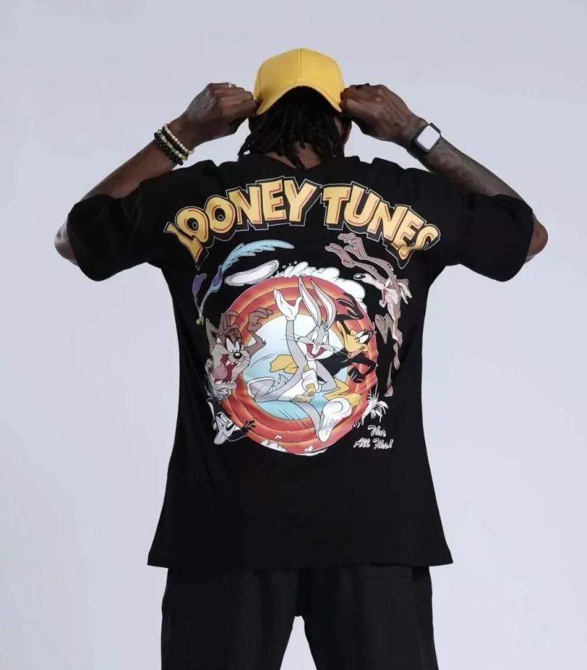 Unisex Bisiklet Yaka Baskılı Oversize T-Shirt – Siyah