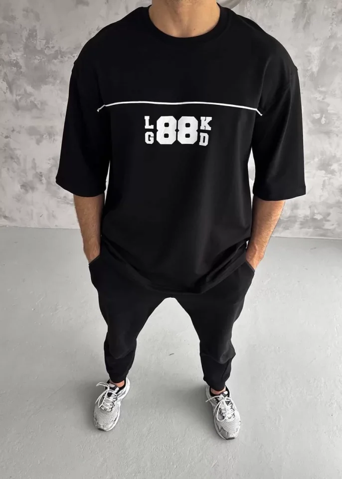 Unisex Bisiklet Yaka Baskılı Oversize T-Shirt – Siyah