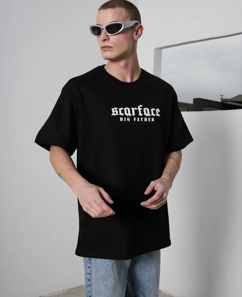 Baskılı Unisex Günlük Stil Siyah Bisiklet Yaka Oversize Tişört