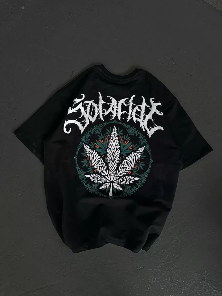Unisex Bisiklet Yaka Baskılı Oversize T-Shirt – Siyah