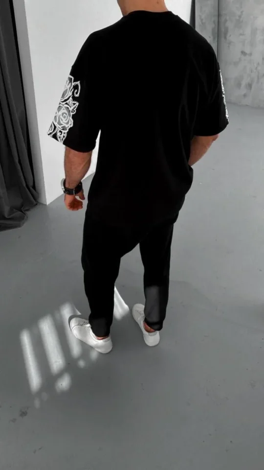 Unisex Flok Kabartma Baskılı T-Shirt – Siyah