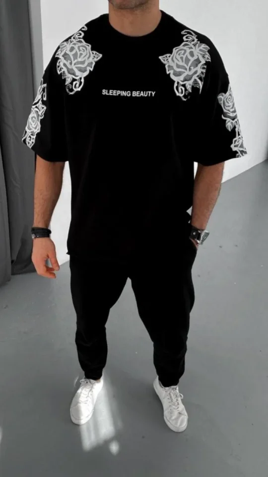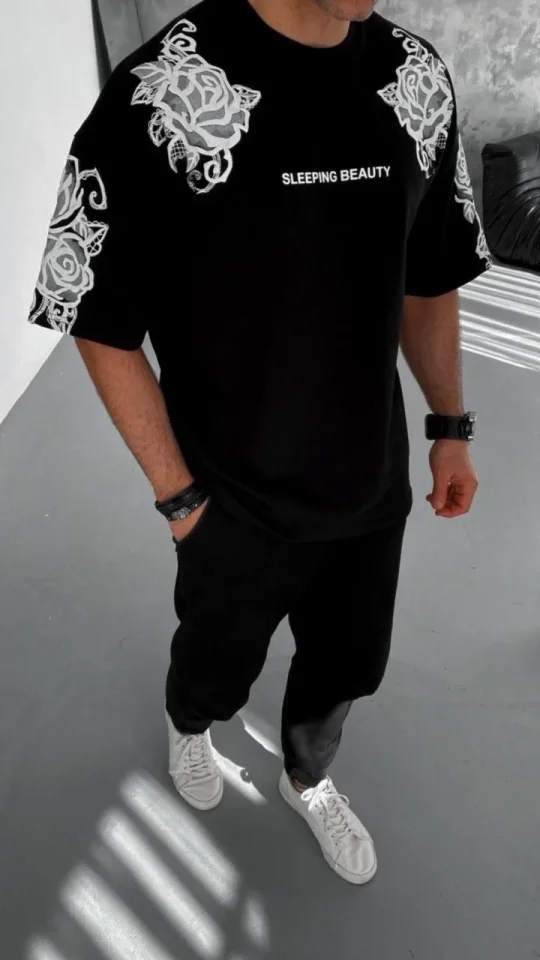 Baskılı Unisex Günlük Stil Siyah Flok Kabartma Tişört