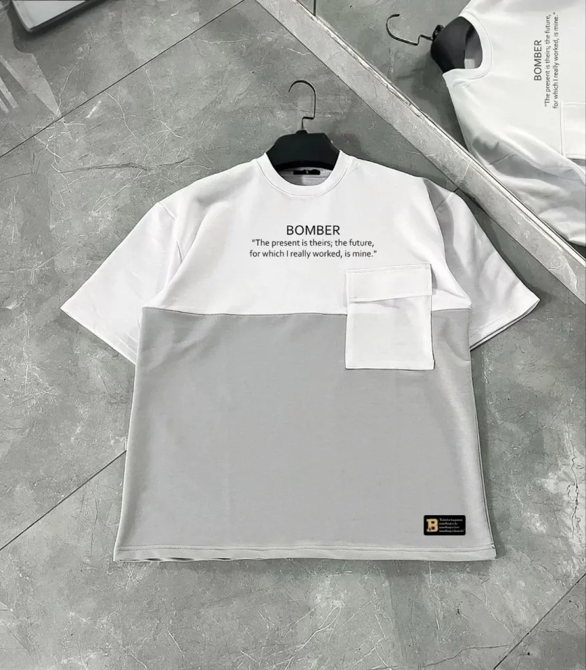 Unisex Torba Cep Detaylı  Parçalı T-Shirt – Gri
