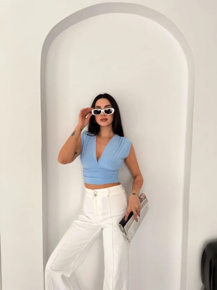 Vatkalı Kolsuz V Yaka Drapeli Crop Bluz Likralı Fit – Bebek Mavisi